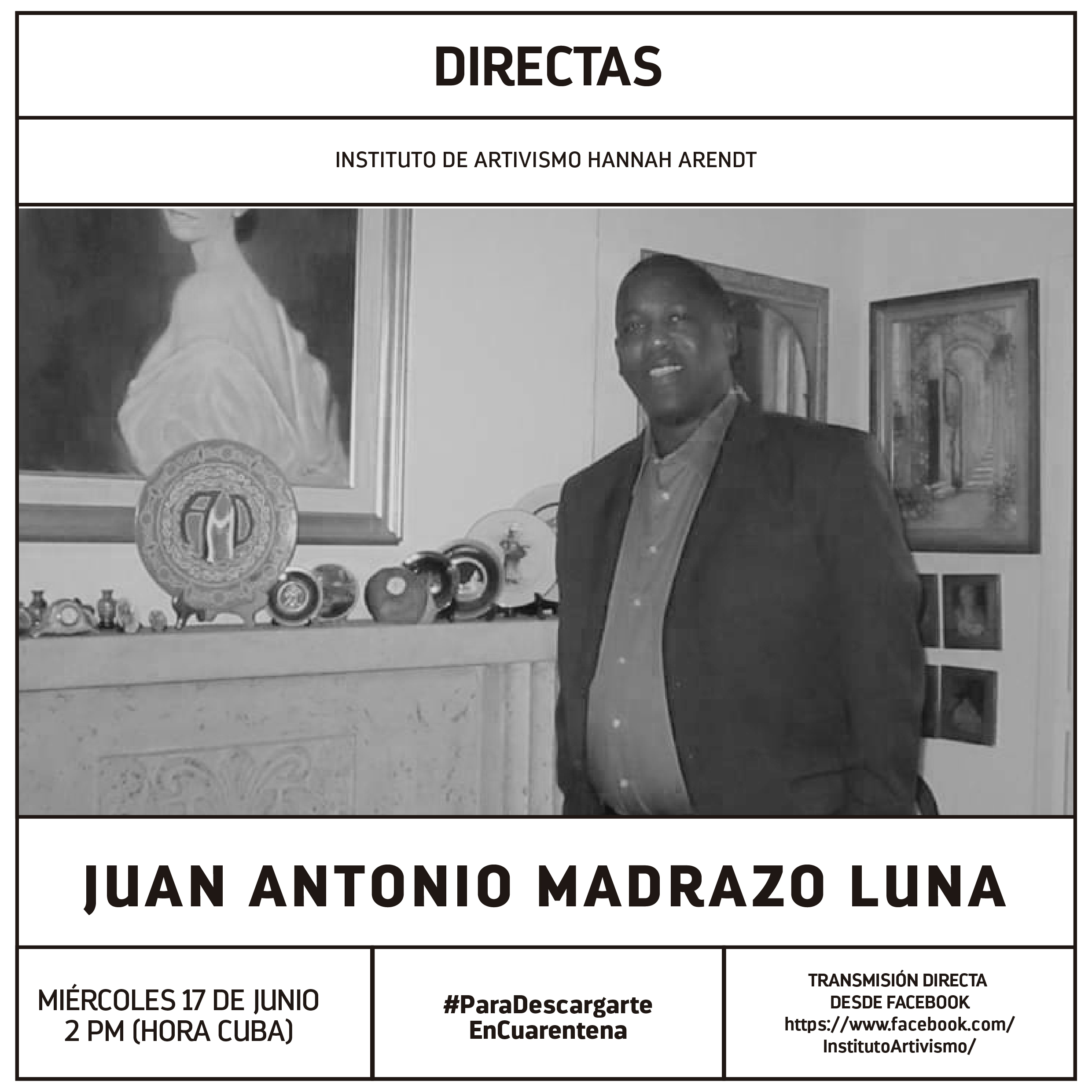 Juan Antonio Madrazo Luna (La Habana, 1968). Observador de Derechos Humanos, Licenciado en Estudios Culturales y Coordinador del Comité Ciudadanos por la Integración Racial (CIR), plataforma de la sociedad civil creada en el 2008 por un grupo de activistas, académicos y líderes comunitarios, sensibilizados con visualizar en la esfera pública la problemática racial en Cuba.